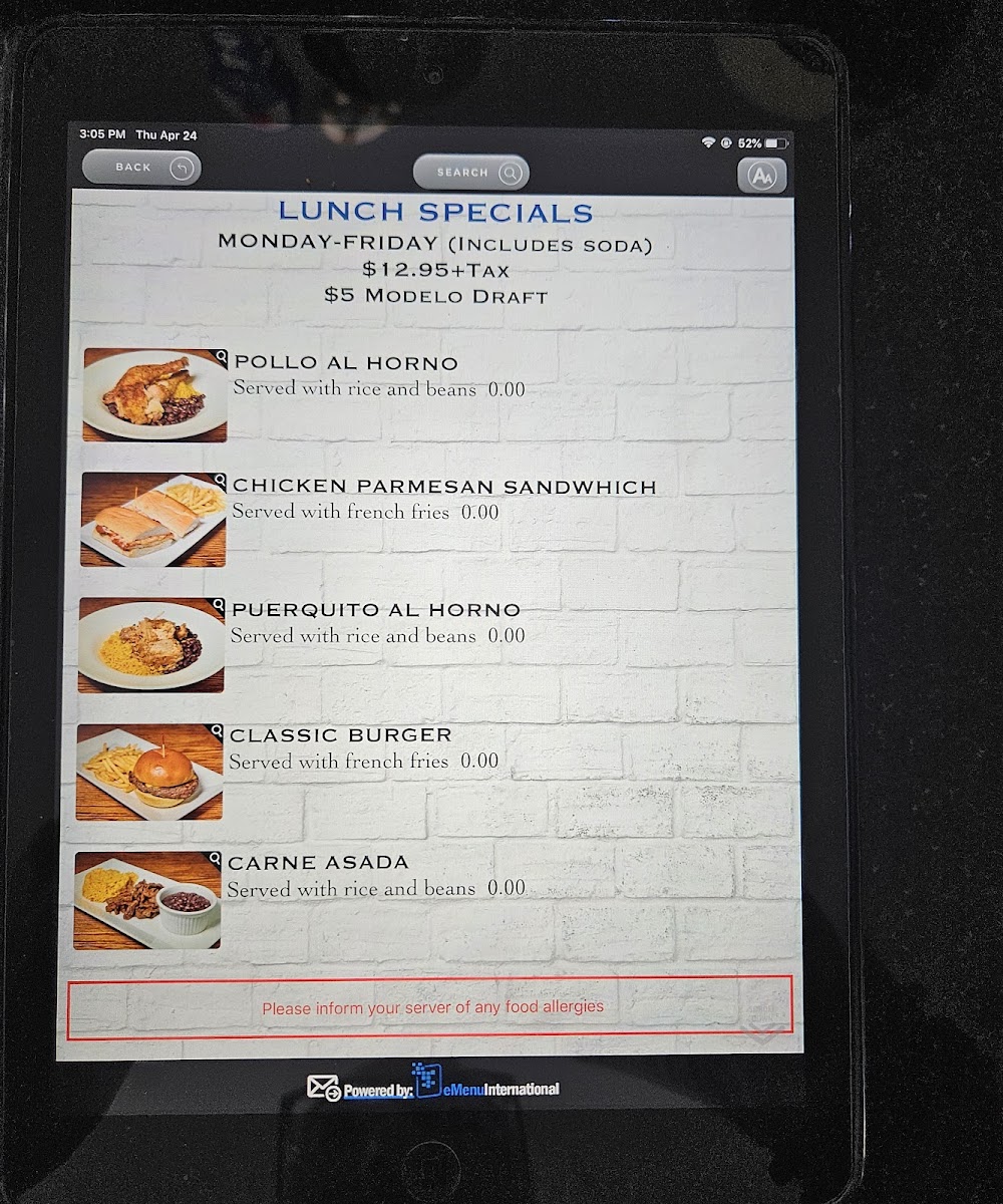 Sautéed red peppers, poblano peppers, onions, marinated steak, shrimp, chicken, and Oaxaca cheese. Served with blue corn tortillas, yellow rice and beans.