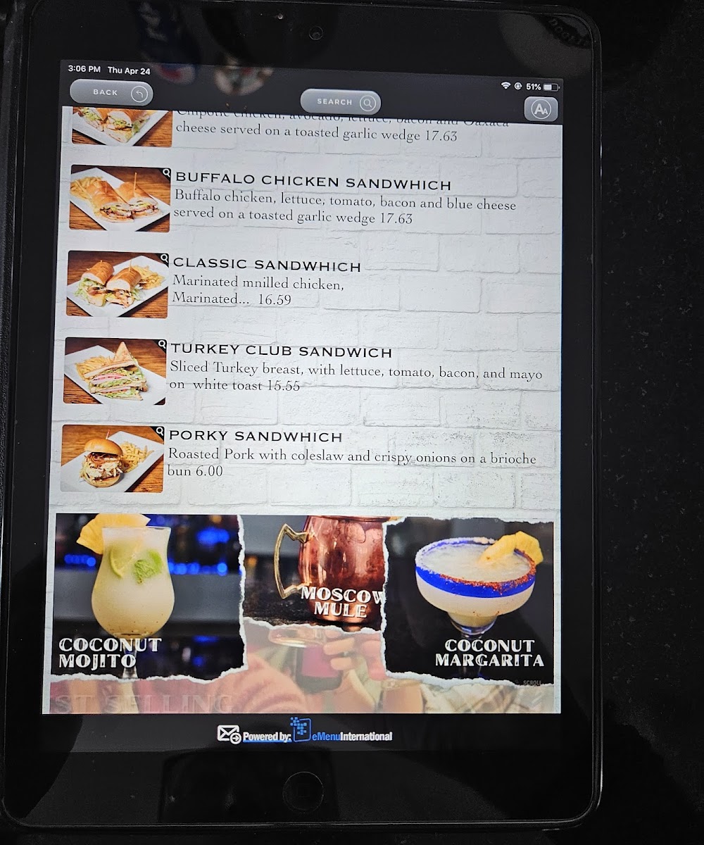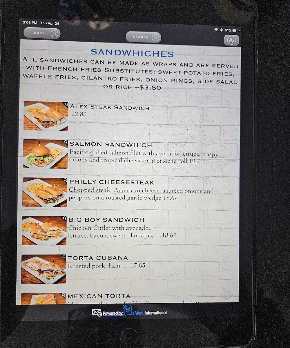 Chicken cutlet, chipotle mayo, lettuce, sweet plantains, mozzarella cheese, bacon, and avocado on a garlic wedge.