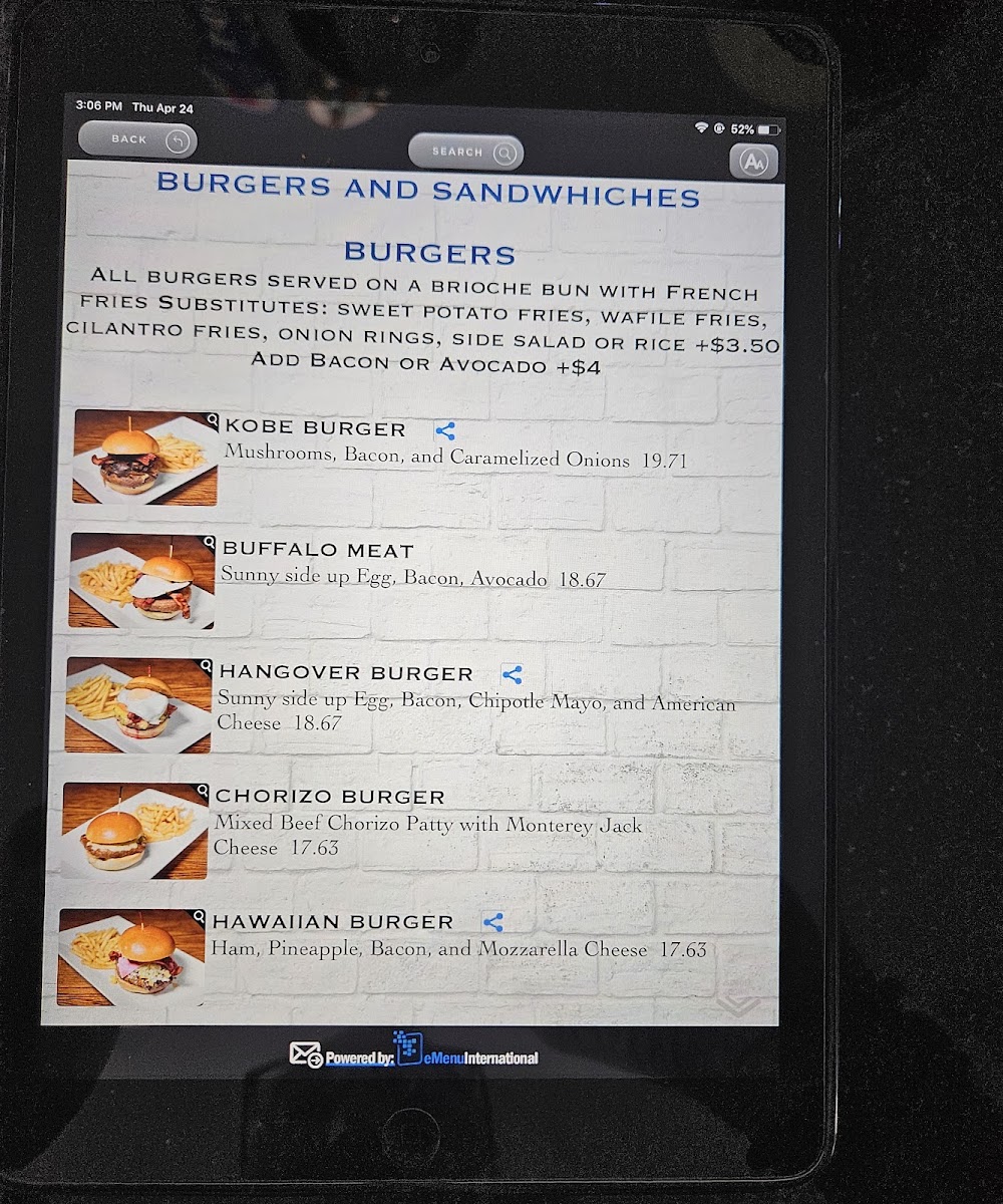 3 pieces. Choice of beef with cheddar and bacon, BBQ pork with blue cheese and tomato. Served on mini brioche buns with a side of french fries.