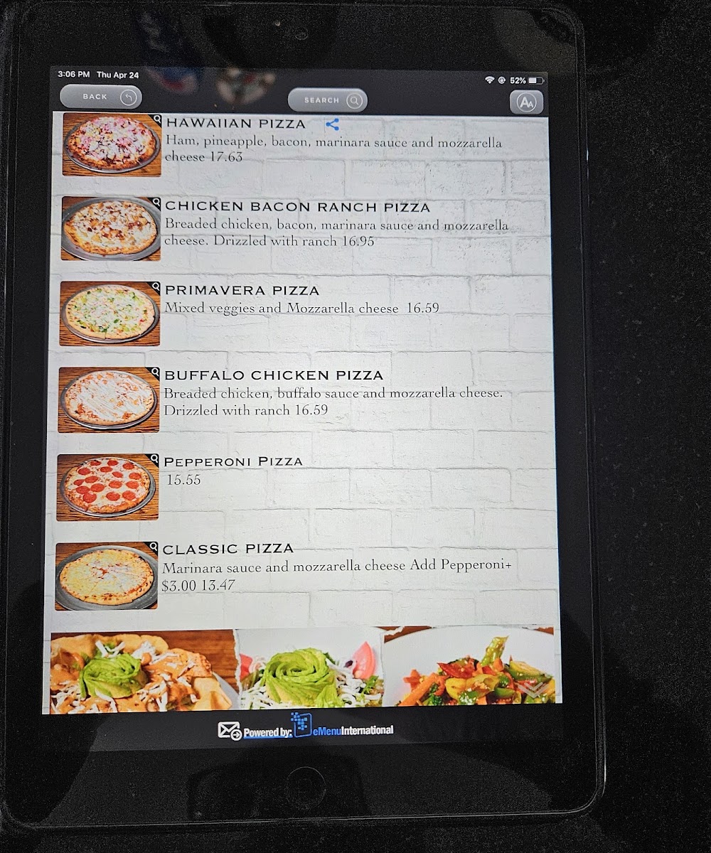 Marinara sauce, breaded chicken, mozzarella cheese, and bacon. Drizzled with ranch.